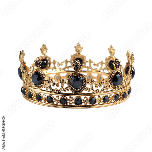 Ornate gold crown adorned with blue sapphires and diamonds isolated on transparent background