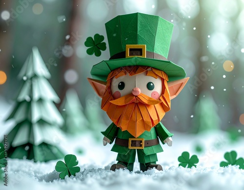 Cute Origami Leprechaun in Snowy Forest with Clovers