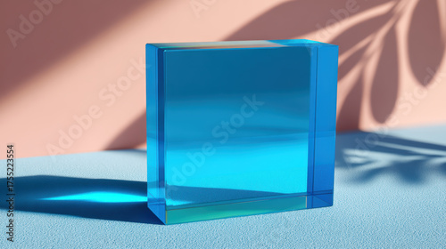 Transparent blue glass block sits on textured surface with soft shadows and pastel background