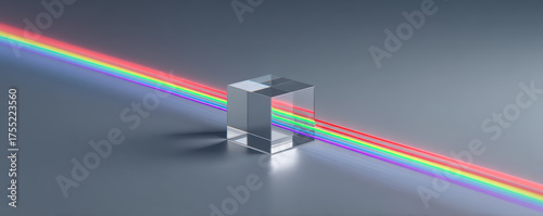 Polished prism on neutral surface refracts light into vibrant spectrum, creating colorful refraction lines