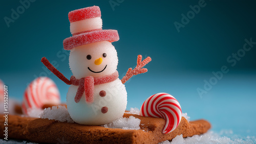 Sweet sugar snowman with red hat and candy decorations on blue background