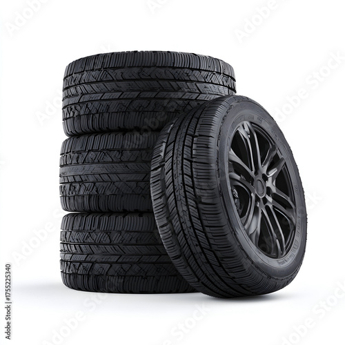 Stack of new black car tires on white background