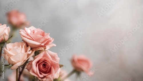 Soft-focus rose blossoms against a muted gray and pink background with room for text, featuring selective sharpness and gentle contrast