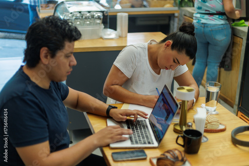 Jóvenes profesionales trabajando y estudiando en una cafetería moderna con laptops y cuadernos.