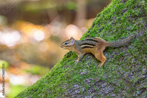 An Eastern chipmunk, Tamias striatus, perched on a moss covered tree trunk in Northern Indiana