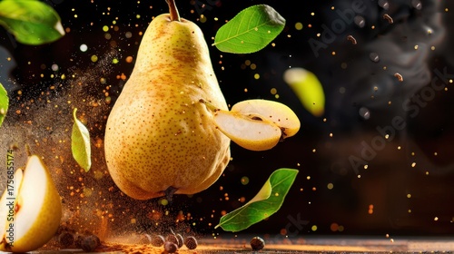 Fresh Pear Sliced with Flying Leaves and Spices on Dark Background for Culinary, Health, and Nutrition Concepts