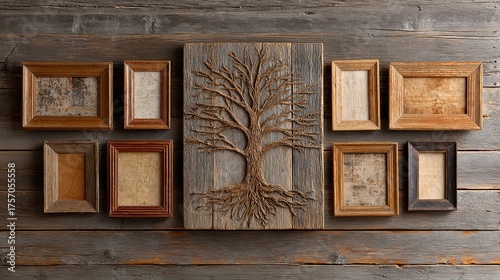 Family Tree Wall Decoration with Empty Picture Frames on a Rustic Background, Ready for Personalized Photos or Artwork