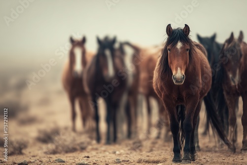 Majestic brown horse walking towards camera amidst a herd in a misty desert landscape