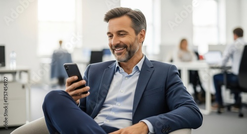 Smiling Businessman Using Smartphone in Modern Office. Confident businessman in a suit smiling while using his smartphone in a bright modern office, reflecting communication, success.