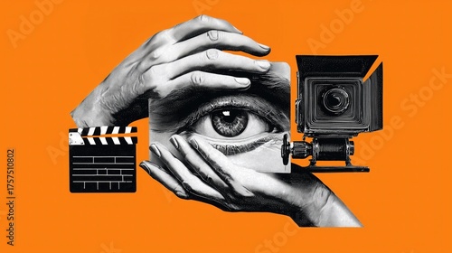 Retro Collage Art With Hand, Eye, Vintage Camera And Clapperboard On Orange Background, Conceptual Photography And Film Design For Wallpaper, Poster, Art Exhibition Concept