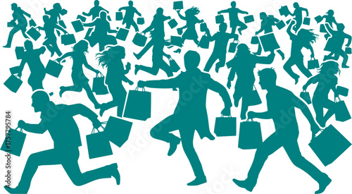 Black Friday Doorbuster Crowd Running Silhouette - People with Shopping Bags Vector for Retail Rush & Holiday Sale