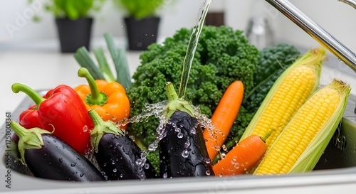Fresh vegetables getting a refreshing wash in the sink for a healthy meal preparation