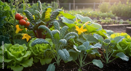 Vibrant organic vegetable garden bursting with fresh produce in the golden sunlight