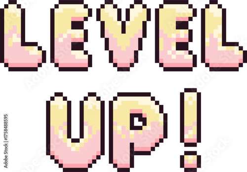 pixel illustration of pastel pixel text "LEVEL UP!" with effect