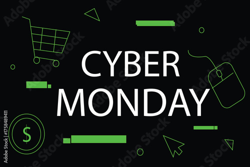 Neon Cyber Monday Sale Banner with Online Shopping Elements Vector
