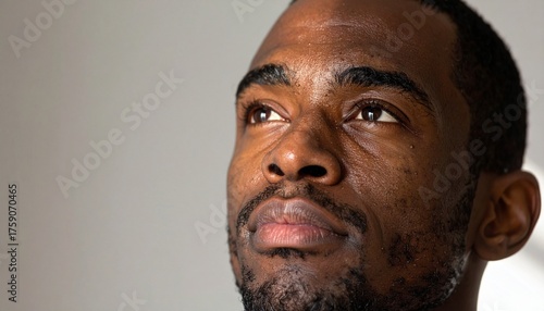 Close-up portrait of thoughtful African American man looking upward symbolizing strength and inspiration