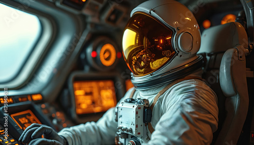 Astronaut inside spacecraft controls glowing dashboard. Person in white suit and gold helmet operates futuristic tech. Space explorer pilots ship through stars.