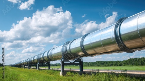 Long Metallic Pipe Structure Under Blue Sky with Clouds and Green Grass on a Sunny Day in Industrial Landscape