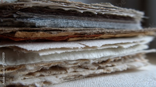 Close-up View of Textured Vintage Paper Stacks Showcasing Varied Tones and Layers Ideal for Artistic and Creative Backgrounds or Projects