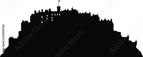 Historic castle skyline silhouette on mountain peak with medieval architecture towers and fortress walls, detailed black vector illustration for design background