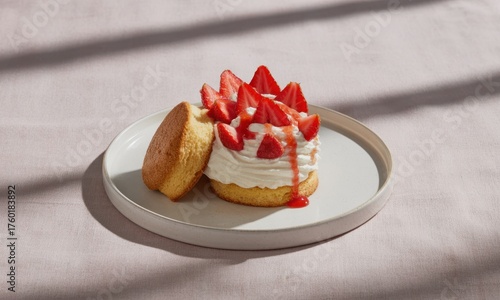 Deconstructed strawberry shortcake with whipped cream and fresh strawberries on white plate