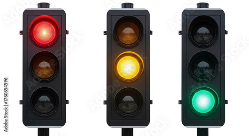Three vertical traffic lights showing red yellow and green signals illuminated against a dark background