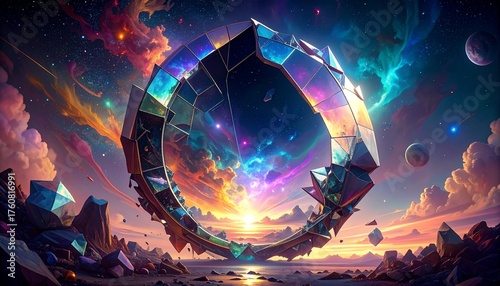 An ancient crystalline ring artifact serves as a cosmic gateway against a backdrop of a vibrant nebula and sunset