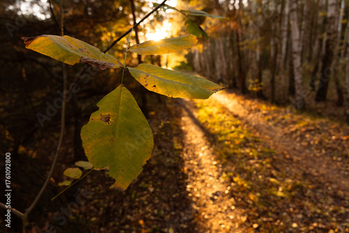 droga przez las podczas złotej godziny. w tle widać wpadające promienie słońca. Na pierwszym planie widać liście drzew