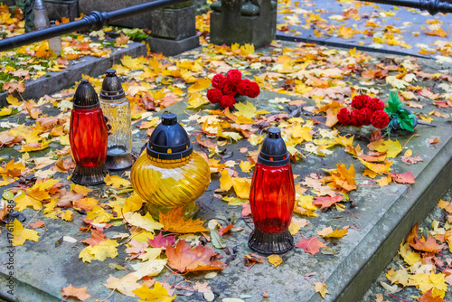 Red glass memorial candles placed among colorful autumn leaves on grave covers at Powązki Cemetery Warsaw Poland fall. High quality photograph