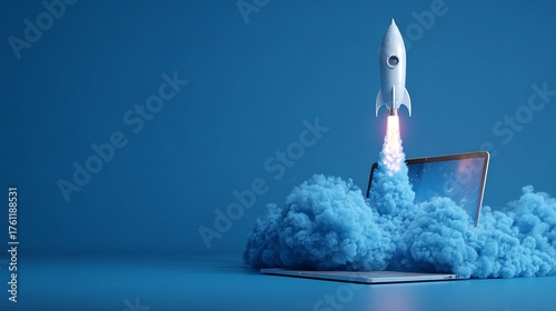 Stunning blue startup concept with rocket launching from laptop symbolizing business growth and innovation for tech companies and digital marketing campaigns