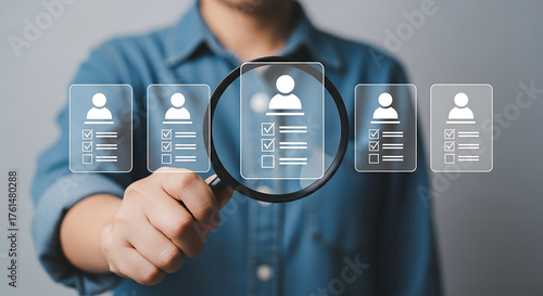 Recruitment Scrutiny: A detailed analysis of potential candidates is undertaken. The magnifying glass highlights the precision and critical evaluation in the selection process.