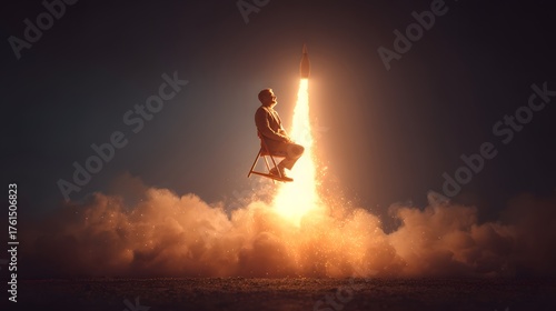 Person seated on a chair attached to a rocket launches into the sky.