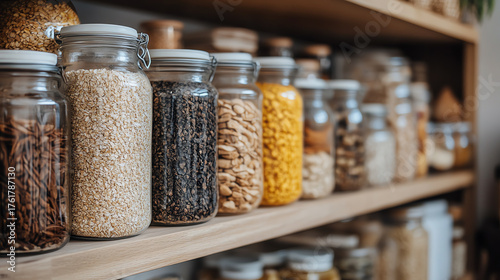 Family organizing pantry with dried foods and grains, winter readiness and sustainability concept