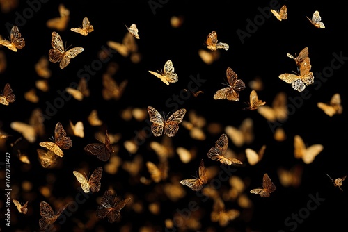 Numerous golden-brown butterflies in various stages of flight on a black background