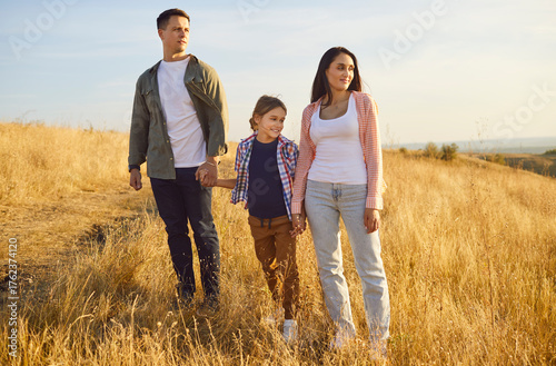 Happy family walking at sunset together in scenic nature landscape. Parents and child stroll through golden meadow to enjoy hike, father and mother holding cheerful son by hand with love and smiling