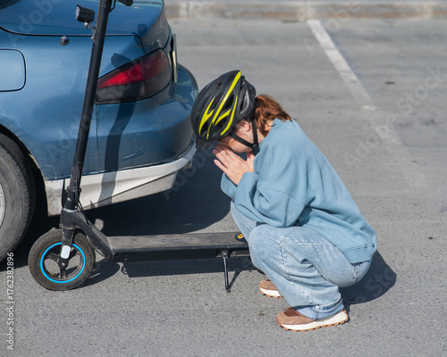 A distressed woman examines the damage after a collision between an electric scooter and a car.