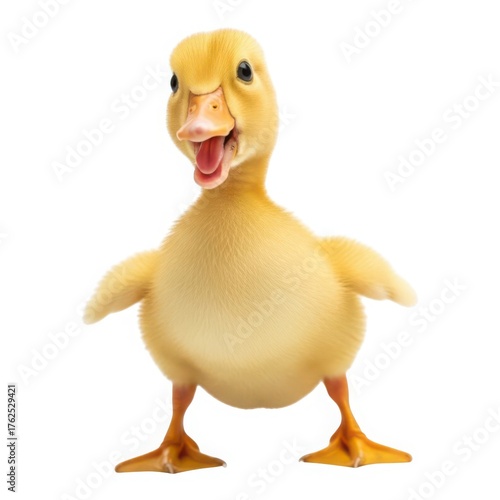 Adorable and funny yellow duckling with an expressive face and open beak standing proudly