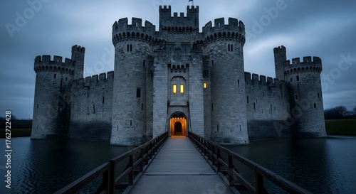 Massive stone castle with high walls and turrets features a wooden drawbridge leading over water