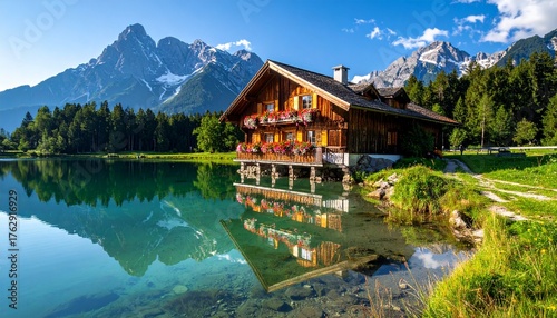 Traditional Austrian Mountain Hut - Alpine Lake Reflection with Snow Peaks in Tyrol