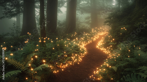 Enchanted Forest Path Lined with Candles for a Magical Night Walk. A winding forest trail glows with hundreds of candles, creating a warm, magical atmosphere.