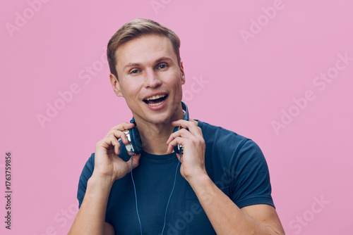 Upbeat young caucasian man wearing casual blue t-shirt and headphones, smiling happily while enjoying music, standing against pastel pink background. People leisure lifestyle concept, positive emotion