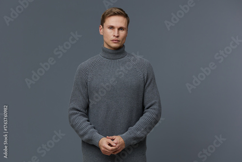 Male model in a cozy gray turtleneck sweater looking serious and contemplative, standing against a plain dark gray background. Casual fashion concept, studio portrait, fashion styling, autumn or