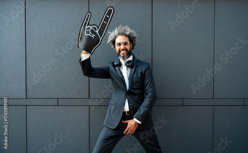 #638496884A stylish man wears sunglasses and a black jacket, leaning against a modern white wall, exuding confidence and charm.