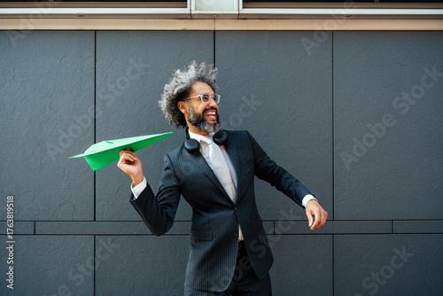 #226193019confident successful mature male with beard in elegant suit standing with arms crossed and looking away with smile against gray wall, concept of business and middle age man lifestyle