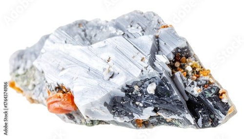 Angular specimen with silver-grey striations, black patches, and orange-brown inclusions on a white background