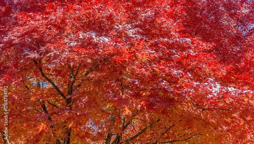 A bright day with a light snowfall highlights the vivid red leaves of a fiery autumn tree perfectly.