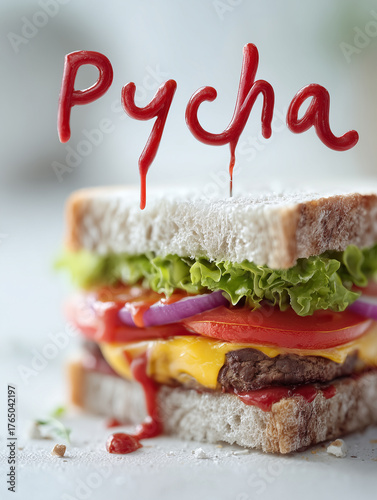 Kreatywny "burger" z dwiema warstwami chleba tostowego zamiast bułek, z serem, wołowiną, warzywami i sosem. Nad nim napis "Pycha" z keczupu.