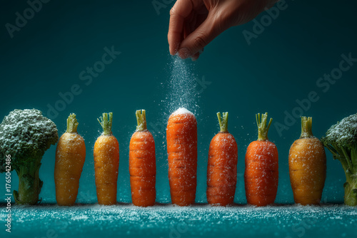 Rząd marchewek i brokułów, z dłonią solącą największą marchewkę na tle morskim. Kontrast zdrowego jedzenia z nadmiarem soli.