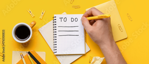 Male hand with to-do list, notebooks, cup of coffee and stationery on yellow background