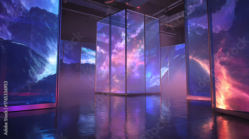 A captivating display of digital art, showcasing vibrant projections within a modern interior setting
